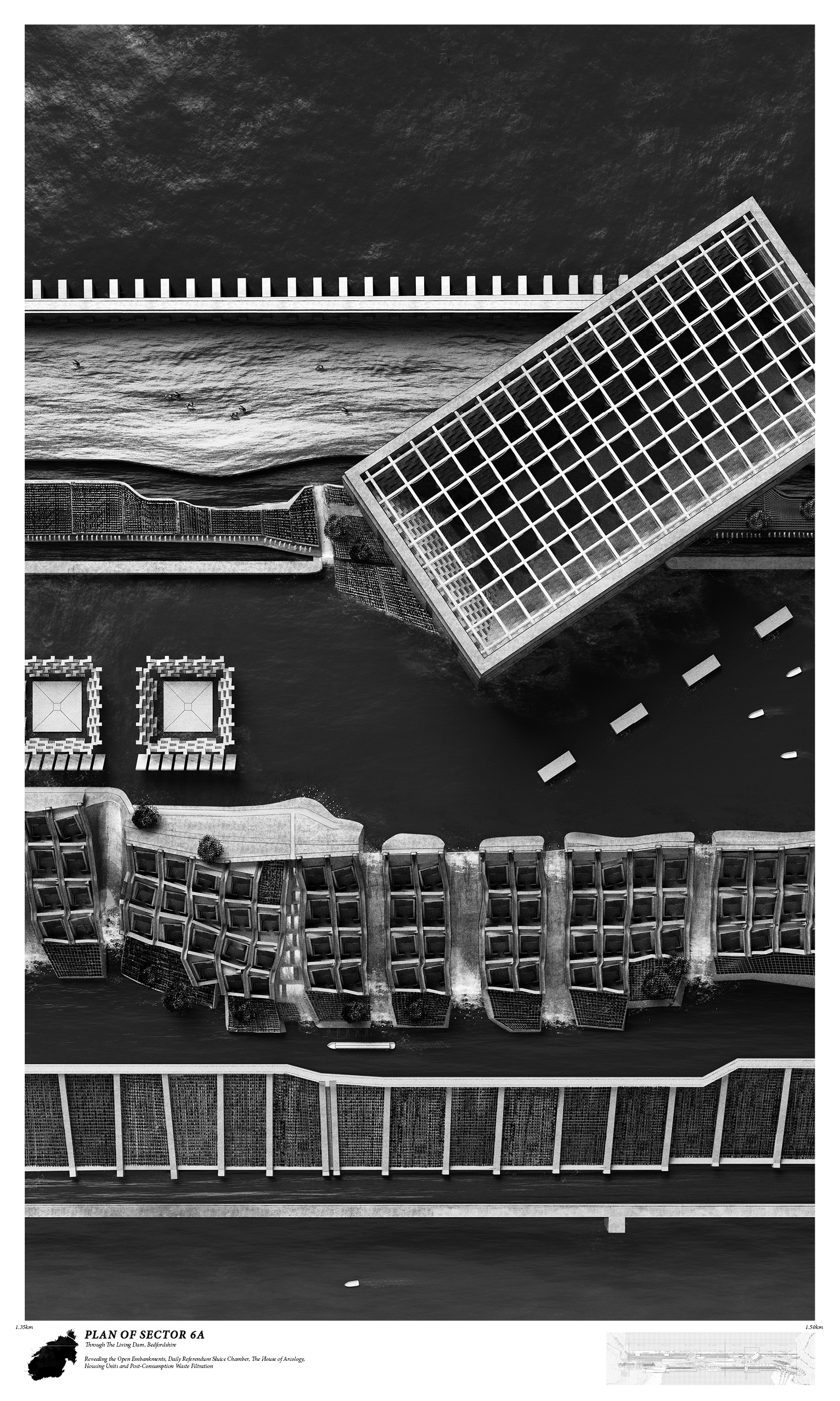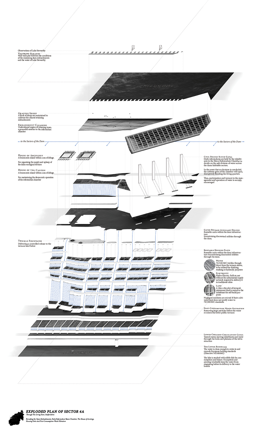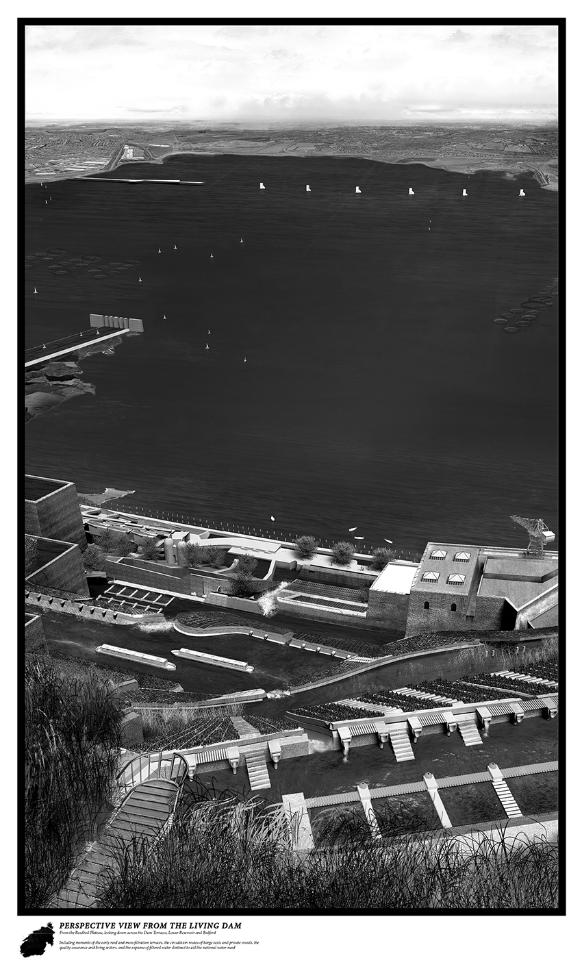 At the lower tiers of the Living Dam, where the water is at its purest, plots for a community for 10,000 inhabitants are provided. The community’s occupation is in the intensive maintenance of the ecologies and the considered management and distribution of water both for the inhabitants and the wider environment. Living is incentivised by reduced utility rates (catered through the community’s immediacy to its water source and hydro-electric source), initially low land prices, the sense of community and the advantageous views across the lower reservoir and Bedford provided by the terraces of the Dam. Quality of water is paramount, and should an inhabitant unsatisfactorily maintain the ecosystem, contaminated water will pass through their home invoking a release clause, evicting them from the dam.