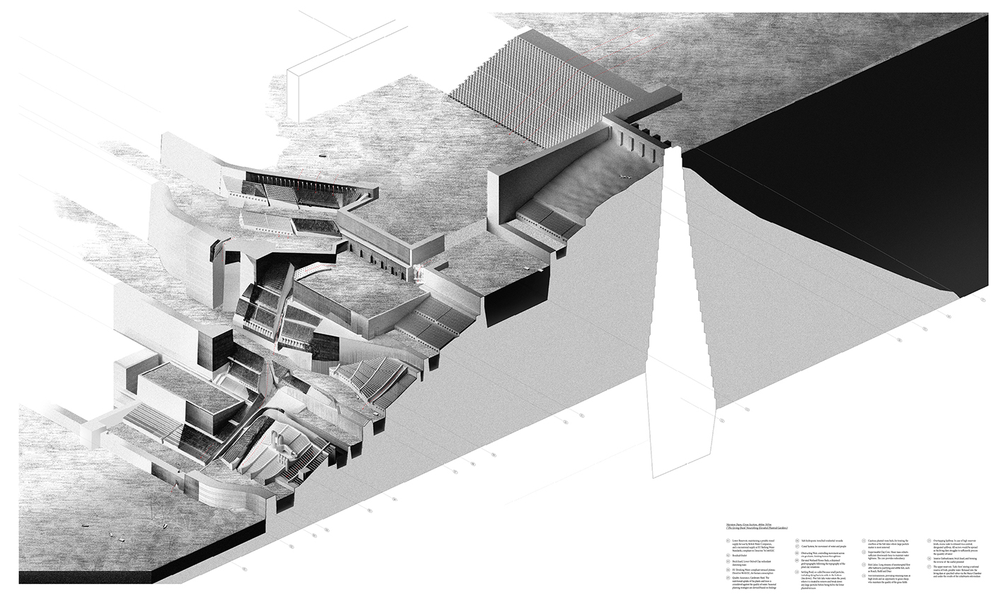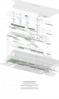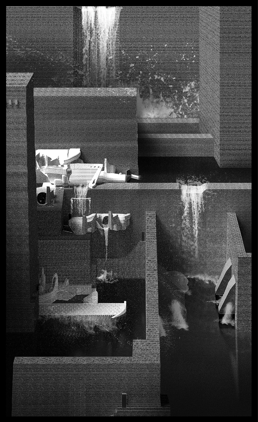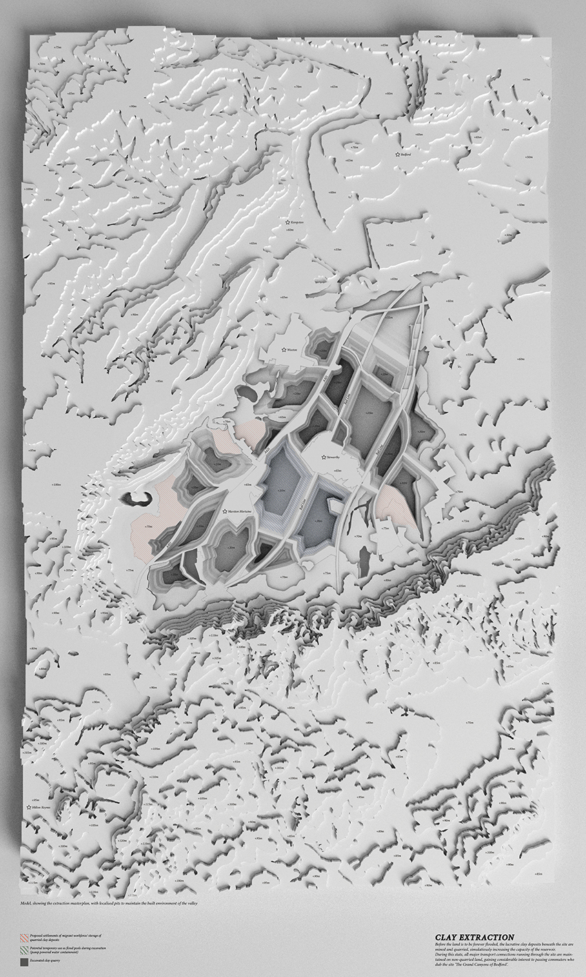 At the lower tiers of the Living Dam, where the water is at its purest, plots for a community for 10,000 inhabitants are provided. The community’s occupation is in the intensive maintenance of the ecologies and the considered management and distribution of water both for the inhabitants and the wider environment. Living is incentivised by reduced utility rates (catered through the community’s immediacy to its water source and hydro-electric source), initially low land prices, the sense of community and the advantageous views across the lower reservoir and Bedford provided by the terraces of the Dam. Quality of water is paramount, and should an inhabitant unsatisfactorily maintain the ecosystem, contaminated water will pass through their home invoking a release clause, evicting them from the dam.