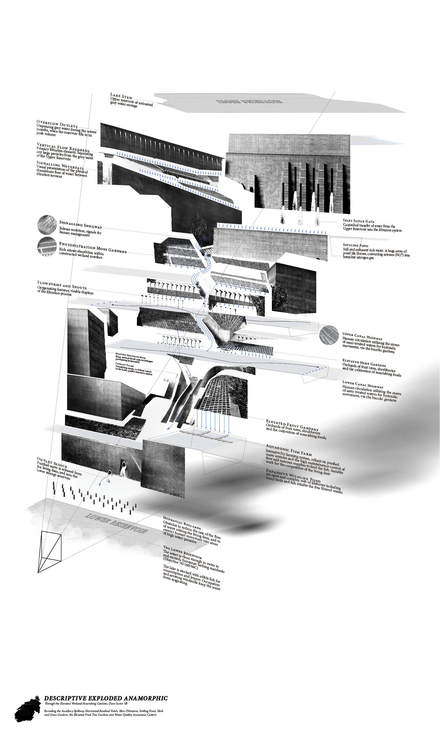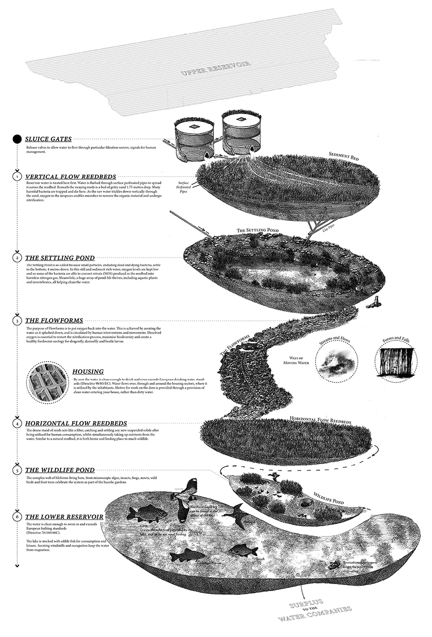 Whilst providing a store for the national asset of water, the project simultaneously provides a series of tiers, terraces, weirs and platypuses which house a series of beneficial ecologies such as reedbed systems, watercress fields, ponds, lakes and elevated fruit gardens for the water to flurry and flow through, building upon the technology of the Living Machine which segregates wetland ecologies into useful components for accelerated water filtration. The ecologies maintained within the dam go beyond the bucolic, and provide purification and filtration of the water beyond EU drinking water directive 98/83/EC as well as nourishing foods for the occupants to maintain and harvest.